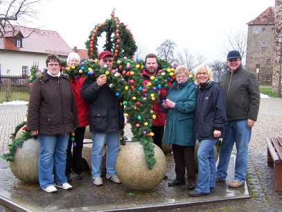 Nach getaner Arbeit und mit zerkratzten Händen: Die fleißigen Helfer der Hohenberger SPD Die "Schmücker" des SPD Ortsvereins ließen sich auch vom Nieselregen nicht abhalten: Pünktlich am Wochenende vor dem Ostermarkt verschönerten sie den Brunnen auf der Mitte unseres Burgplatzes wieder mit Streu und bunten Ostereiern.