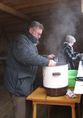 Für die Aufwärmung der durchgefrorenen Gäste sorgte Berndt Amann, der Glühwein und Kinderpunsch gestiftet hatte, und zusammen mit Sieglinde Thoma ausschenkte.