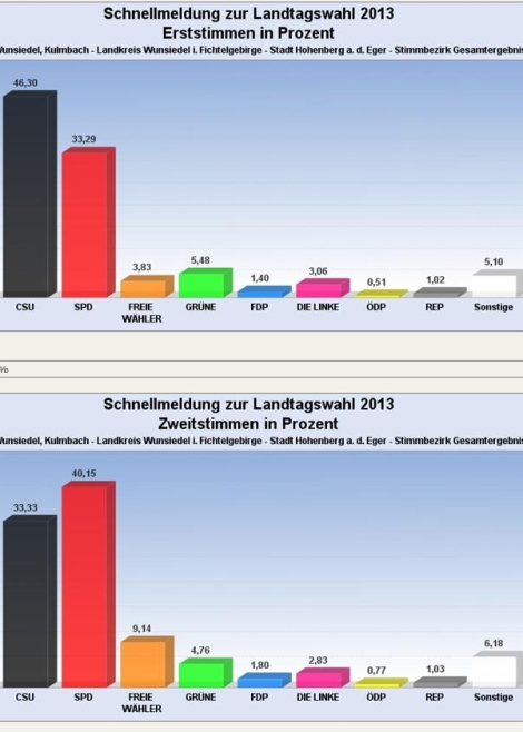 Aber es gibt auch Erfreuliches für die SPD: Mit Inge Aures haben wir für den Landkreis und auch für Hohenberg endlich wieder eine sozialdemokratische Abgeordnete im Landtag. Wir gratulieren ihr zum guten Ergebnis und stellen erfreut und stolz fest, dasss Inge Aures in Hohenberg bei den Erststimmen mir 33,3 % das beste Ergebnis im Landkreis Wunsiedel eingefahren hat. Eine kleine Sensation kann man das Zweitstimmenergebnis nennen: Hier liegt die SPD mit 40,2% klar vor der CSU mit 33,3% und den FW mit 9,14%.