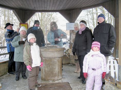 Die traditionelle SPD-Oberstwanderung führte den eisernen Kern der Unentwegten um Hohenberg herum und schließlich ins Gasthof Egertal. Während der Runde durch die Eiseskälte wurde an der Carolinenquelle zur Stärkung halt gemacht. Man konnte wählen zwischen Sauerbrunnen und Glühwein, für den Ludmilla Amann gesorgt hatte.