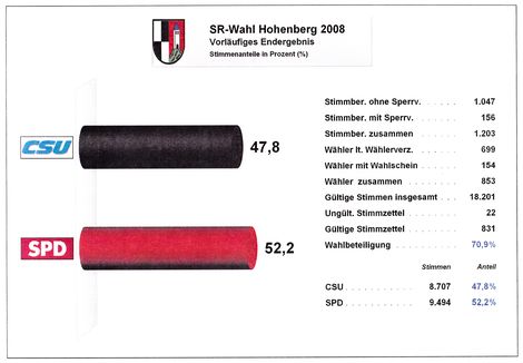 Das amtliche Endergebnis, welches für die Aufteilung der Sitze im Rathaus maßgeblich ist, zeigt nachweislich ein ganz anderes Bild. Die CSU erhielt demnach 8.707 und somit 787 Stimmen weniger als die SPD, die auf 9.494 kam. Außerdem hatte die CSU im Jahr 2008 – wie bereits 2002 – sechs Mandate und keines zusätzlich erreicht.