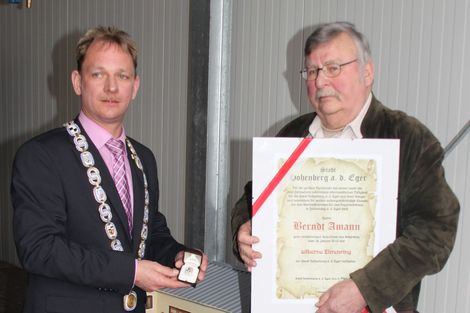 Bürgermeister Jürgen Hoffmann überreicht dem geehrten Berndt Amann Urkunde und Silbernen Ehrenring.
