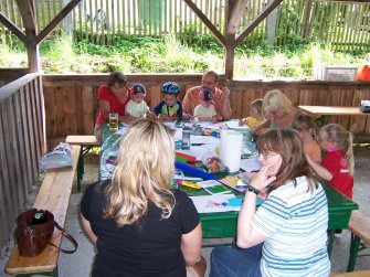 Viel Spass hatten die Kleinen in der Bastelecke bei Dagmar und Andrea Offensichtlich waren die Hohenberger SPDler besonders brav gewesen. Dies lässt zumindest das herrliche Wetter vermuten, welches pünktlich zum Festbeginn das noch tags zuvor herrschende trübe Nass abgelöst hatte.