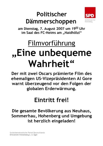 Al Gores preisgekrönter Film über die globale Erwärmung wird am Dienstag, 7. August in der FC-Gaststätte "Haidhölzl" vorgeführt. Unbedingt ansehen!