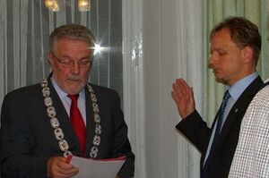 Dieter Thoma vereidigt in der Stadtratssitzung Jürgen Hoffmann als neuen Bürgermeister. Das scheidende Stadtoberhaupt blickt auf seine 15-jährige Amtszeit zurück.